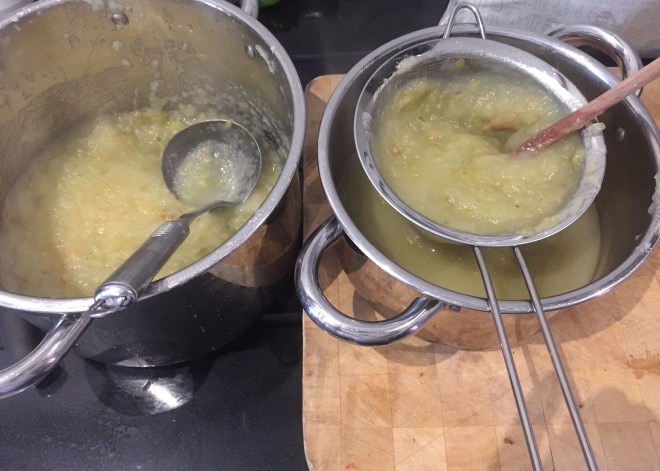 Not amazing lookers – but these cookers make the best pectin. Full of vitamins and once boiled down, these apples from the orchard make the smoothest apple pulp. Just quarter them and immerse in boiling water (no peeling). 15 minutes later, strain, mash and pass through a sieve.