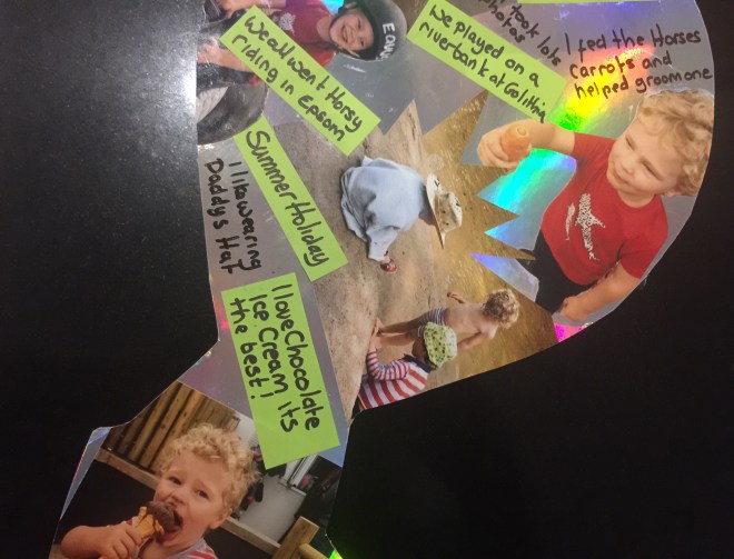 For the reception year induction, our little ones were asked to talk to their teachers and classmates about their summer holidays. On our meeting with three of the teaching staff last month, we were given three sparkly, refractive cut outs of hot air balloons. Today I chopped up photographs as the printer at home is still not working and pritt sticked the hell out of a few of our summertime memories.