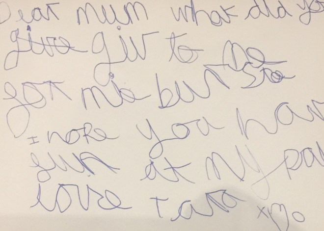 Anyhow, this is what she wrote: “Dear Mum – What did you give to me for my birthday. I hope you had fun at my birthday party. Love Tara x❤️o