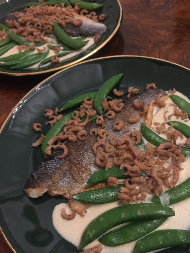 The picture says it all – sugar snap peas embraced sea bass, brown shrimp and a white wine and cream sauce!