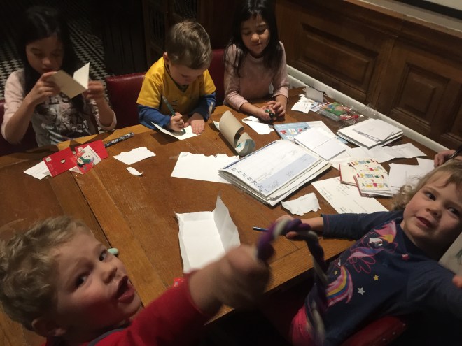 This evening was chosen to be the time the children wrote their Christmas cards. Our nanny Sindy is of course assisting them with me adding my signature later for the grown up cards. Not too many of them this year sadly. For the children’s classmates cards, it seems that there has to be the inclusion of a sweet or chew this year! I don’t know how that came about, but luckily we had a few packs of haribo gums hidden away.